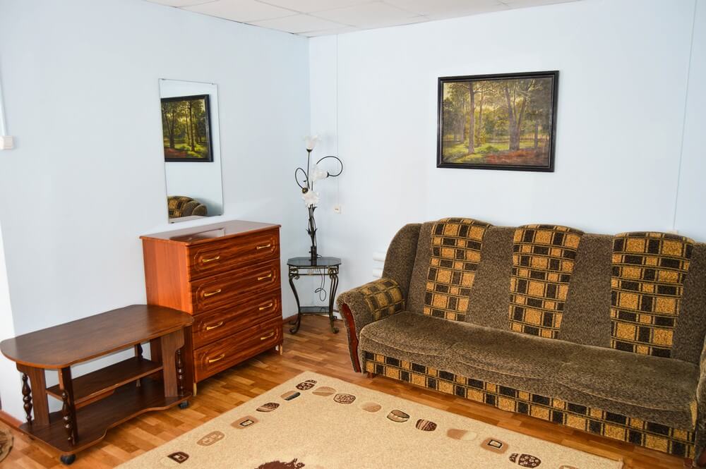 - Мебель: вешалка, кровати односпальные /одна двуспальная кровать, прикроватные тумбочки, стол, стулья, шкаф